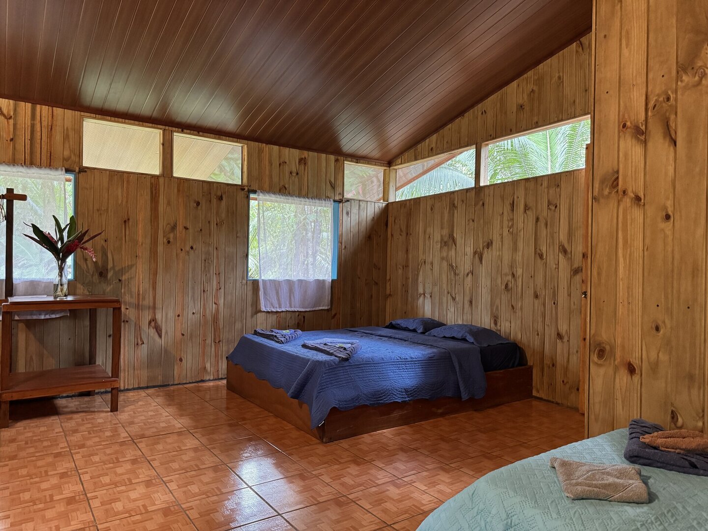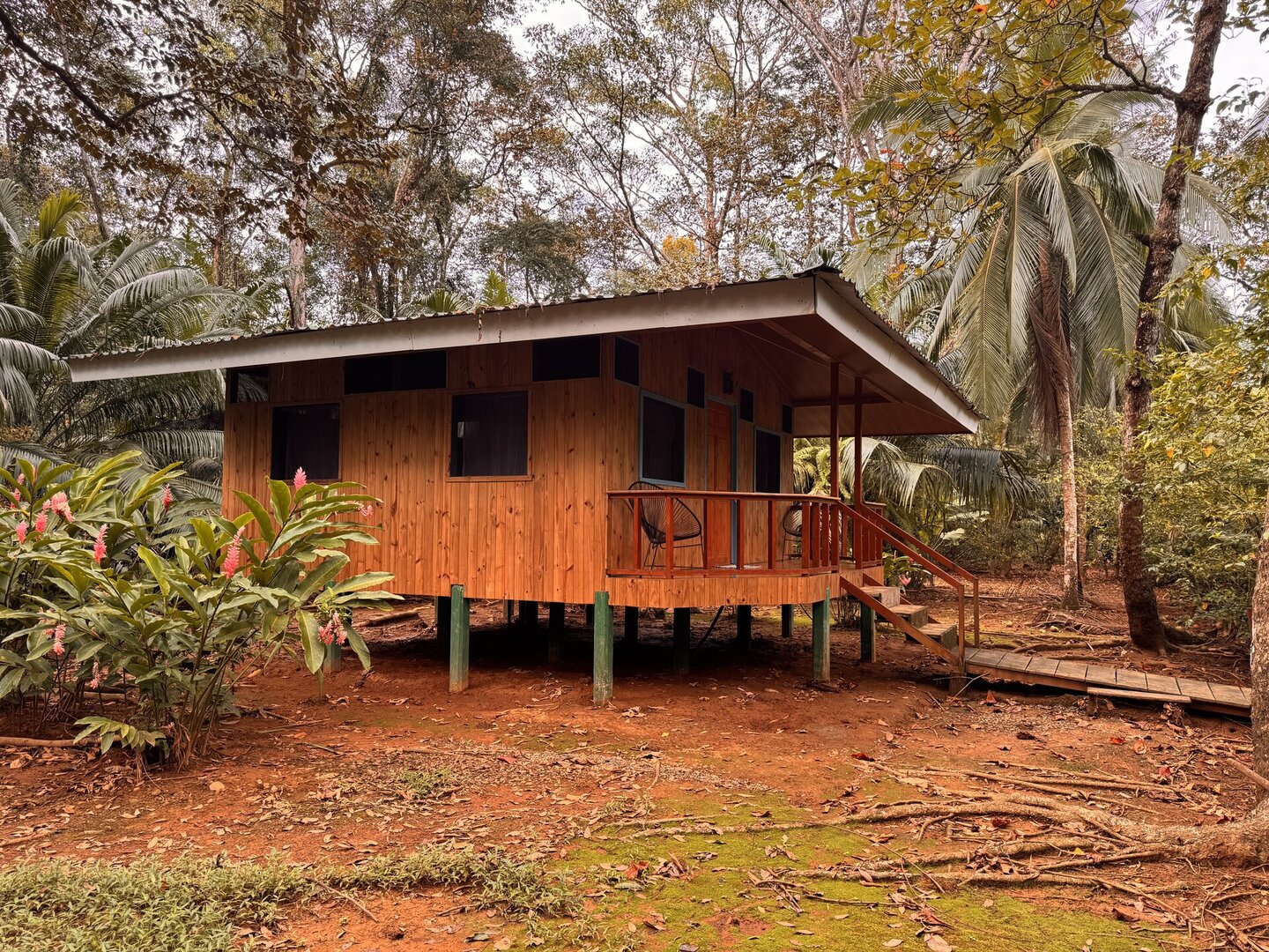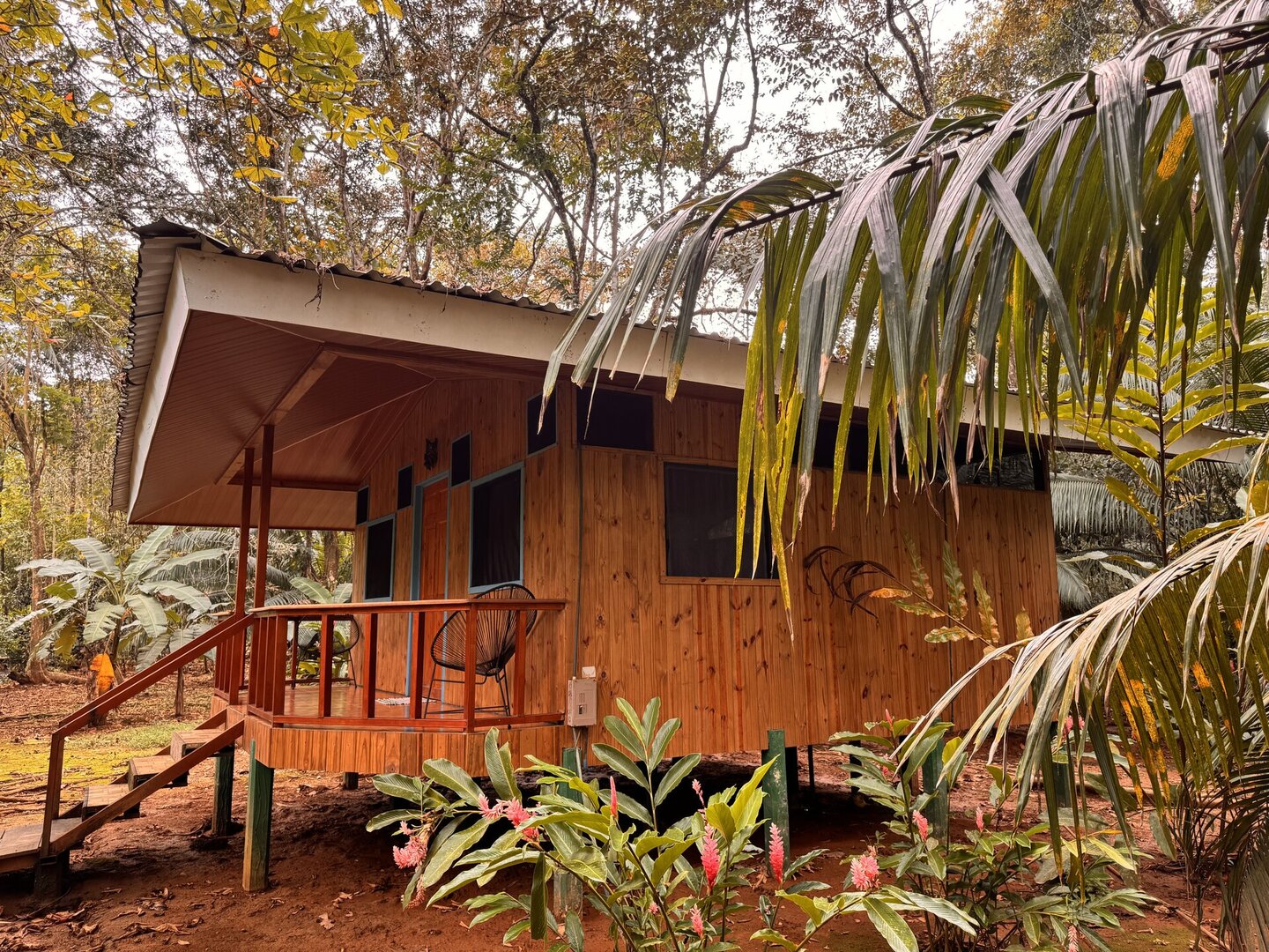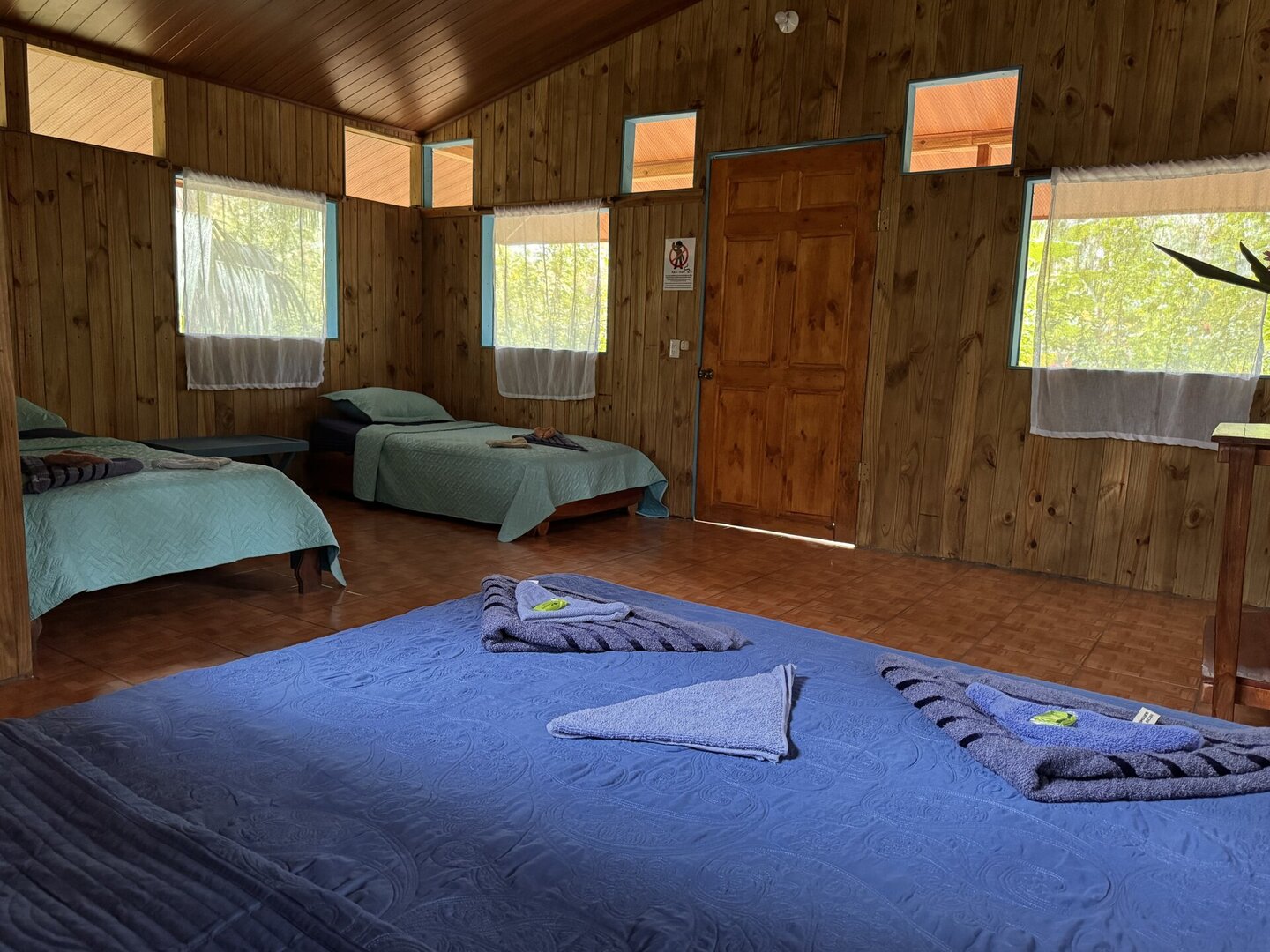 Casa Morpho is our newest cabin and an excellent choice for guests who want to stay right next to the forest. Situated just across the creek and surrounded by dense jungle, it offers a strong sense of privacy and immersion in nature. Like all cabins at Sabalo Lodge, it is elevated on stilts, protecting it from ground moisture and wildlife while allowing natural airflow beneath the structure. Inside, there is one spacious open room furnished with one double bed and two single beds, comfortably accommodating up to four guests. The bathroom includes a shower with hot water, toilet, and sink. The terrace, complete with a hammock, is a perfect place to relax and observe wildlife during the day or at night. WiFi is available within reach of the cabin. Guests are welcome to enjoy our on-site restaurant, evening bar with chilled drinks, and swimming area set in tropical surroundings. Non-alcoholic beverages are available 24 hours a day in self-service mode.