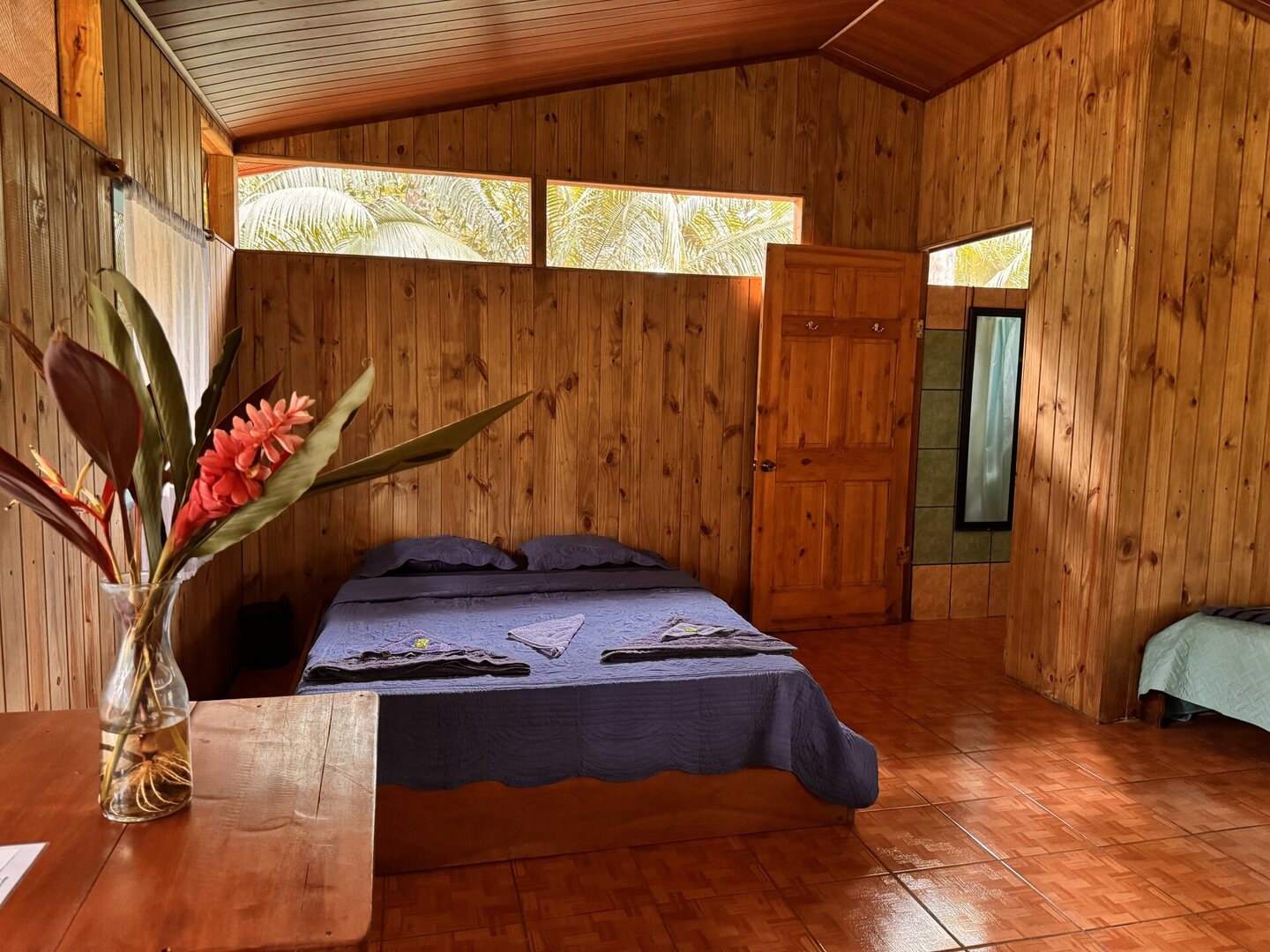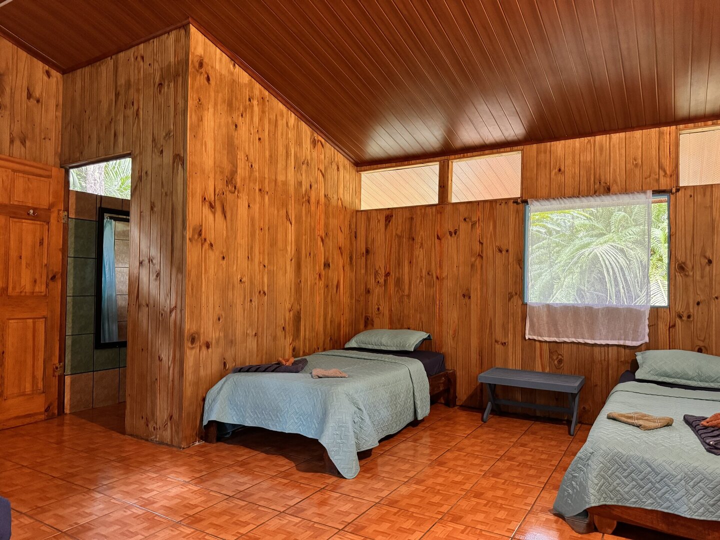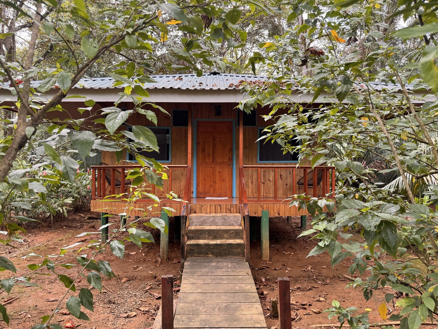 Casa Morpho is our newest cabin and an excellent choice for guests who want to stay right next to the forest. Situated just across the creek and surrounded by dense jungle, it offers a strong sense of privacy and immersion in nature. Like all cabins at Sabalo Lodge, it is elevated on stilts, protecting it from ground moisture and wildlife while allowing natural airflow beneath the structure. Inside, there is one spacious open room furnished with one double bed and two single beds, comfortably accommodating up to four guests. The bathroom includes a shower with hot water, toilet, and sink. The terrace, complete with a hammock, is a perfect place to relax and observe wildlife during the day or at night. WiFi is available within reach of the cabin. Guests are welcome to enjoy our on-site restaurant, evening bar with chilled drinks, and swimming area set in tropical surroundings. Non-alcoholic beverages are available 24 hours a day in self-service mode.