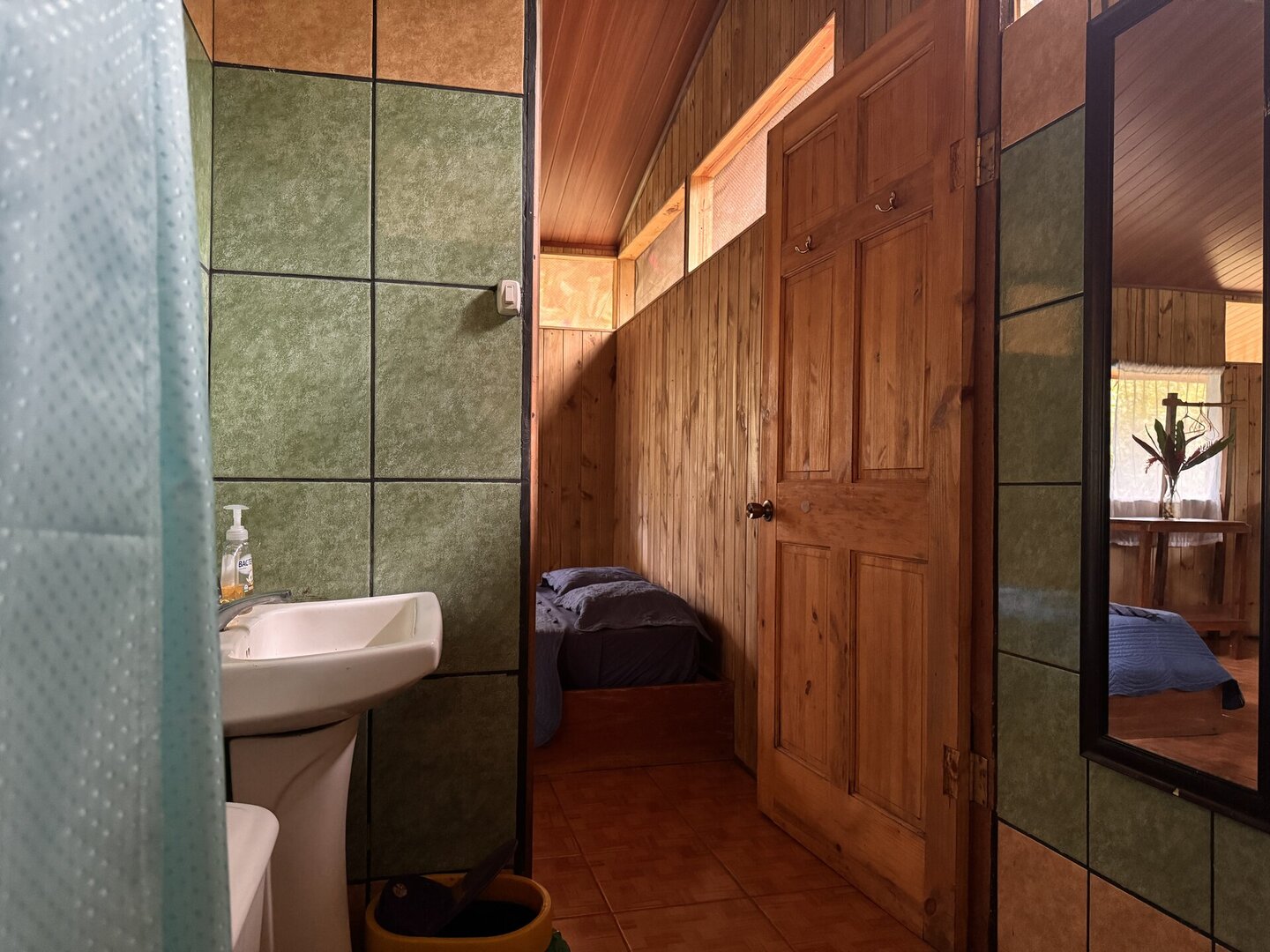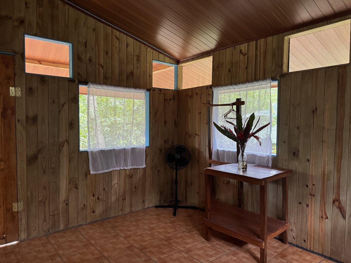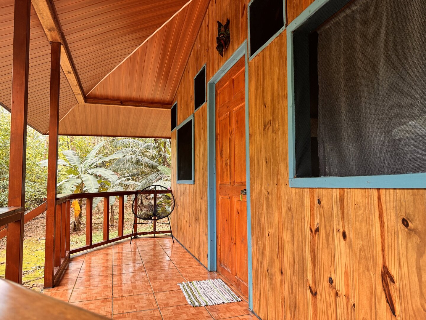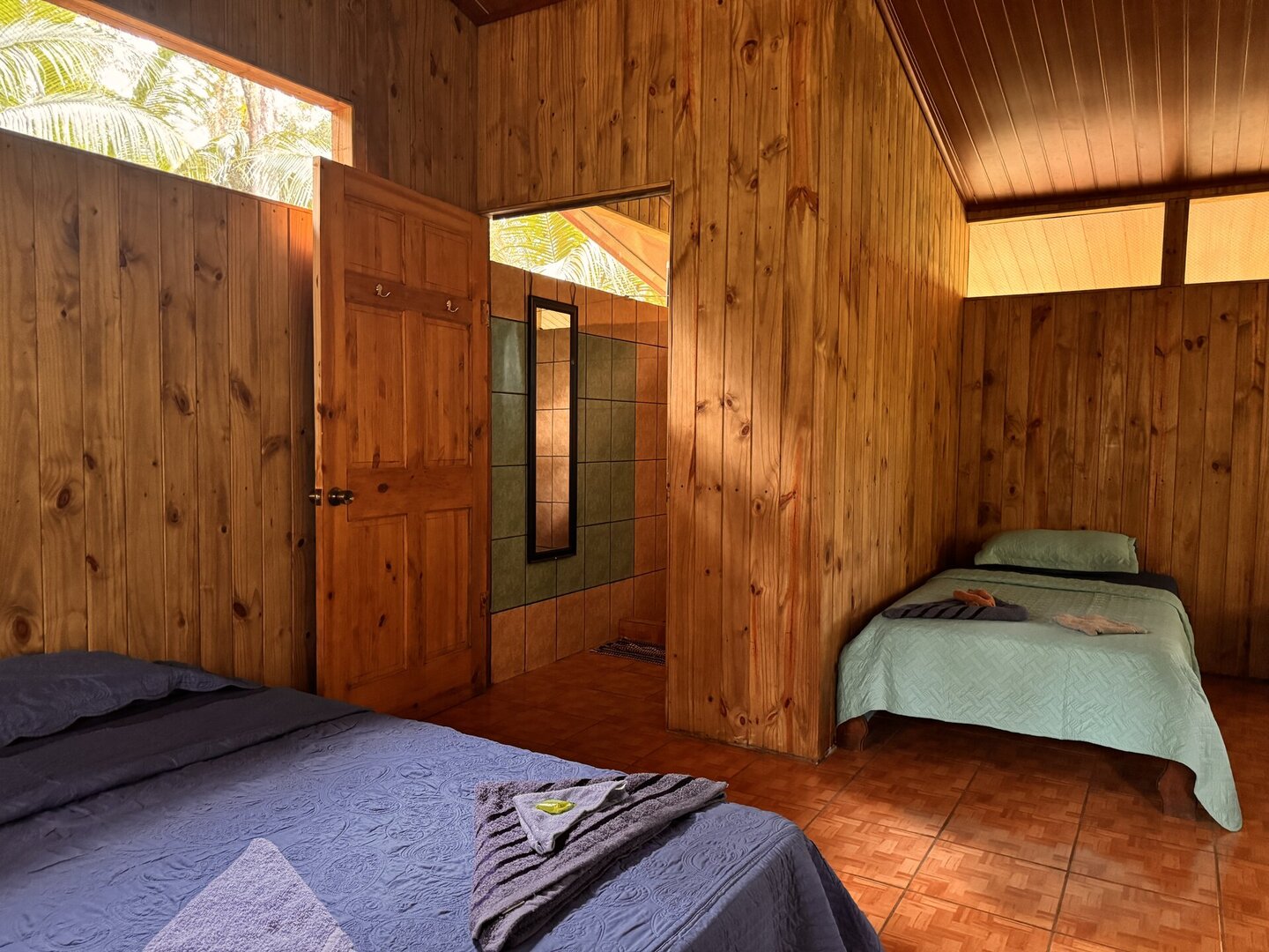 Casa Morpho is our newest cabin and an excellent choice for guests who want to stay right next to the forest. Situated just across the creek and surrounded by dense jungle, it offers a strong sense of privacy and immersion in nature. Like all cabins at Sabalo Lodge, it is elevated on stilts, protecting it from ground moisture and wildlife while allowing natural airflow beneath the structure. Inside, there is one spacious open room furnished with one double bed and two single beds, comfortably accommodating up to four guests. The bathroom includes a shower with hot water, toilet, and sink. The terrace, complete with a hammock, is a perfect place to relax and observe wildlife during the day or at night. WiFi is available within reach of the cabin. Guests are welcome to enjoy our on-site restaurant, evening bar with chilled drinks, and swimming area set in tropical surroundings. Non-alcoholic beverages are available 24 hours a day in self-service mode.