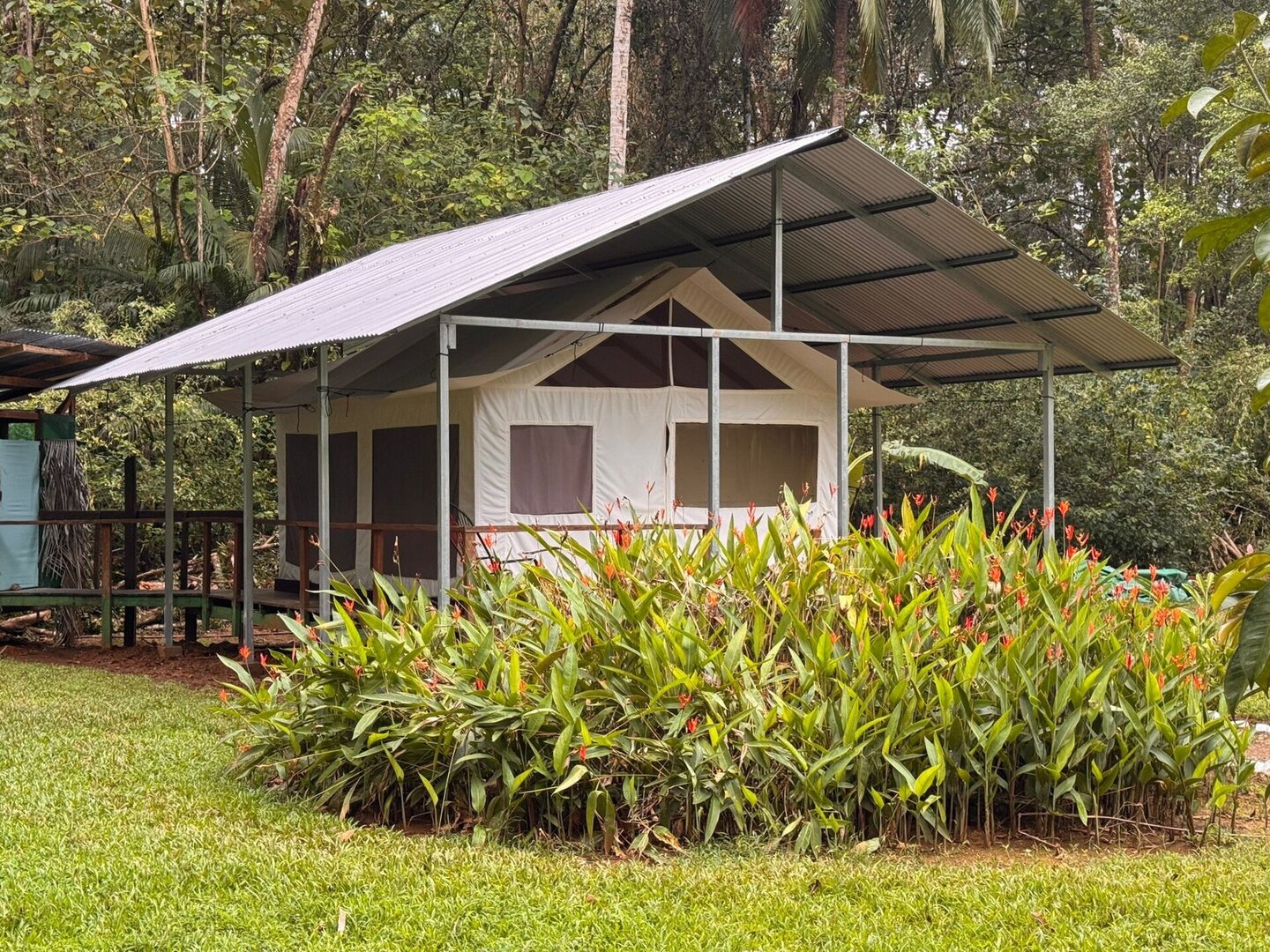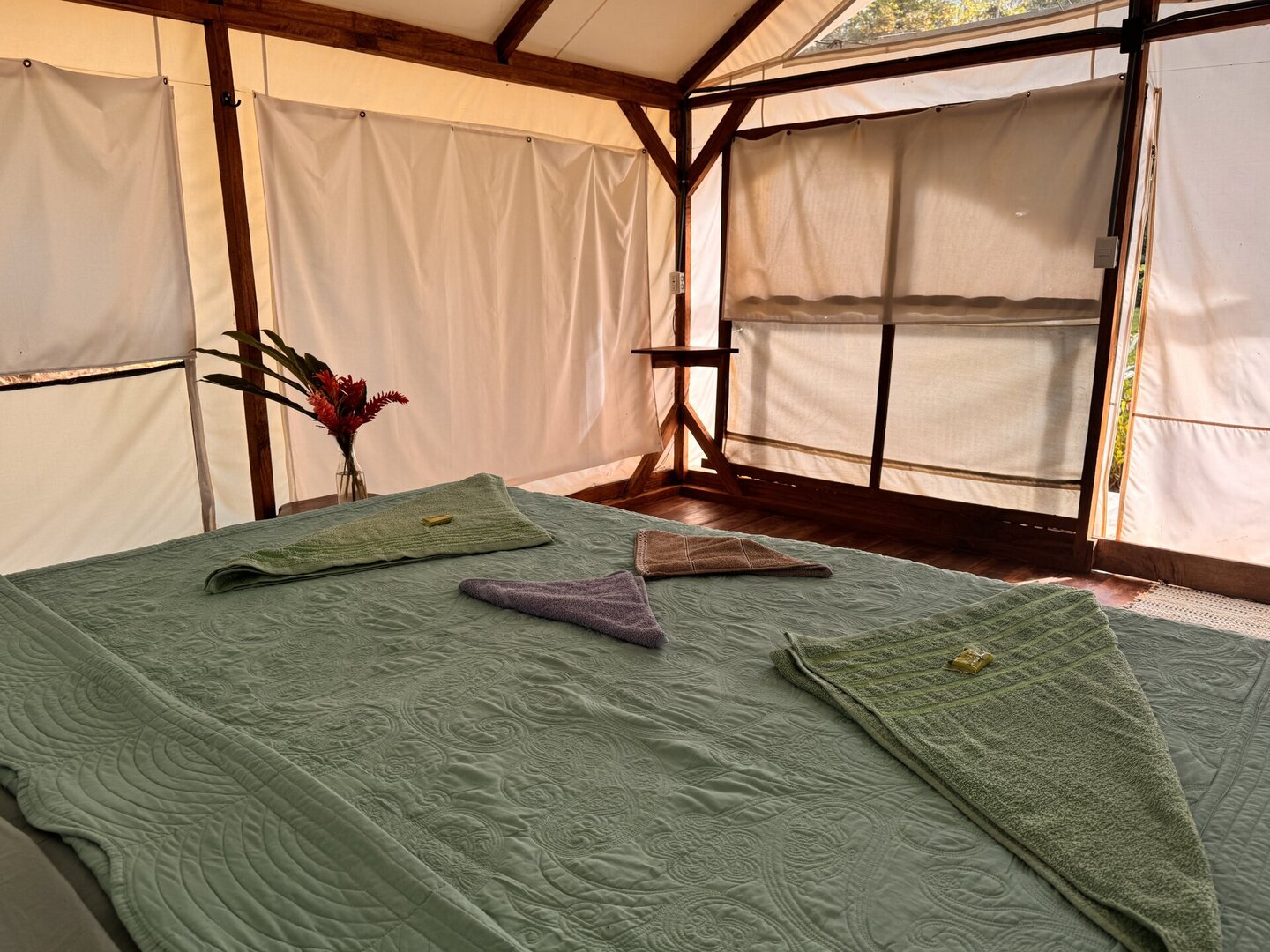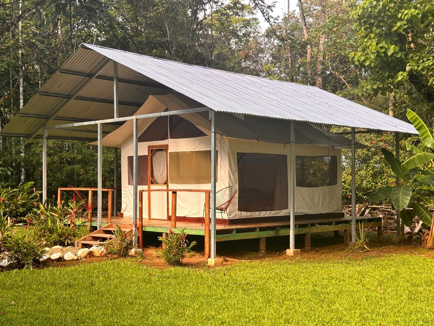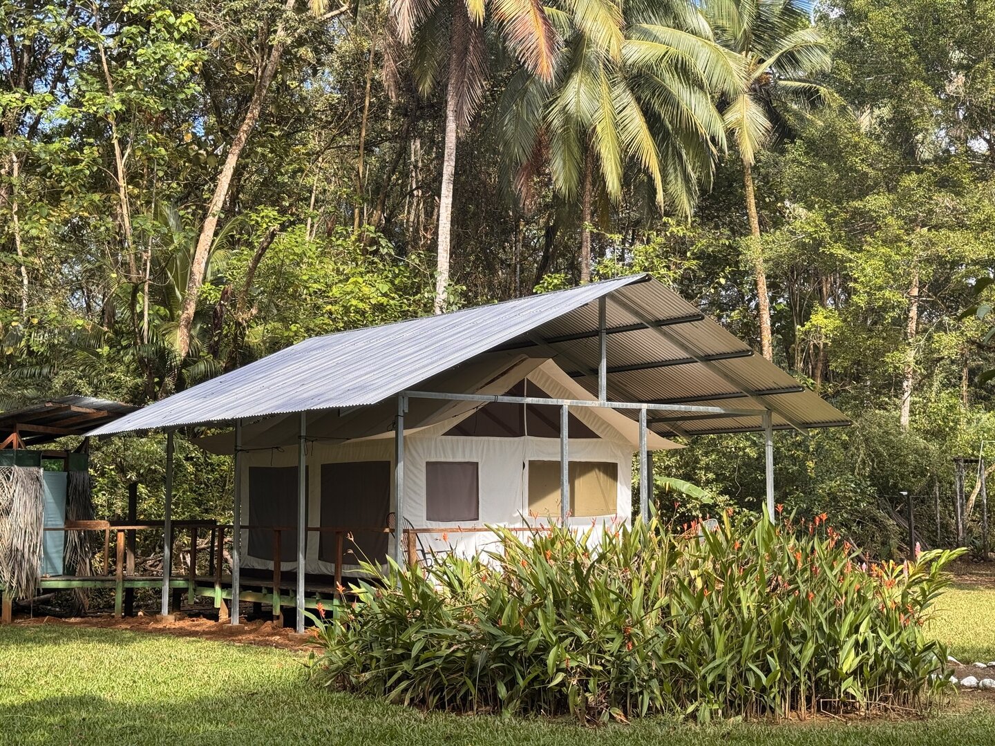 Peaceful jungle tent for 2 guests near the main entrance, with private bathroom, shaded setting and frequent toucan visits.