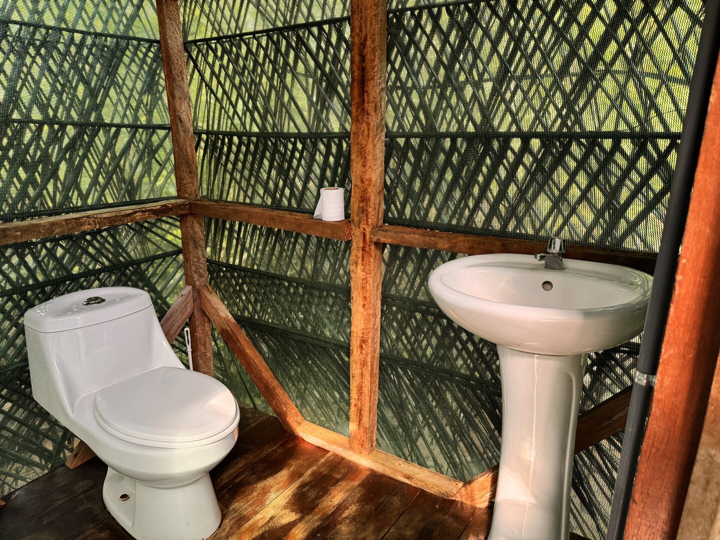 Tienda Amapola offers a calm and comfortable jungle stay close to the main entrance of the property, without the need to cross the creek. A dedicated parking area is located nearby, making access easy while still maintaining privacy and quiet surroundings away from the restaurant, bar, and pool area. The tent is built on stilts and surrounded by a covered wooden deck at floor level. From this sheltered walkway, you reach your private bathroom located in a separate rear unit equipped with a toilet, sink, and shower. Inside the tent, you’ll find a comfortable double bed, 110V electricity, and a ceiling fan. The screened entrance door and mosquito-protected windows allow for natural airflow and open views into the surrounding greenery while keeping the interior fully protected. Recently, all tents were upgraded with a secondary metal roof installed approximately one meter above the original canvas roof. This double-roof system significantly improves ventilation and keeps the interior cooler, while protecting the deck and terrace from sun and rain. A portable air-conditioning unit is available for rent and works effectively when windows are closed. WiFi is available at the tent. Amapola enjoys a slightly more shaded setting due to the surrounding trees. Above the tent stands a tree that often hosts flocks of toucans in the morning, offering guests a memorable wildlife experience right from their terrace. Between Amapola and Tucancito, a shared seating area with benches and a table under a tree provides a pleasant place to relax. Just steps away, a wooden footbridge leads directly into the rainforest, where a network of maintained and marked trails allows for easy wildlife observation and exploration. Guests can enjoy our on-site restaurant throughout the day, unwind with chilled drinks at the evening bar, and cool off in the natural swimming area surrounded by tropical greenery. Non-alcoholic beverages are available 24 hours a day in self-service mode.