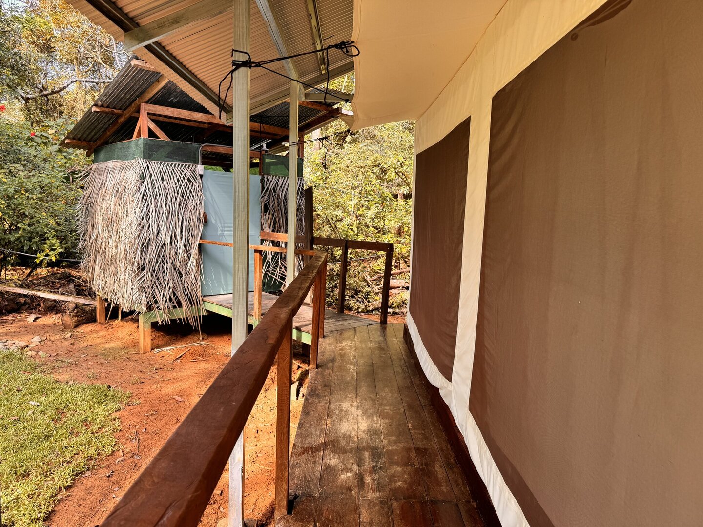 - Double bed, elevated wooden wraparound deck, covered terrace with seating, 110V electricity, ceiling fan, screened entrance door and mosquito-protected windows, built on stilts