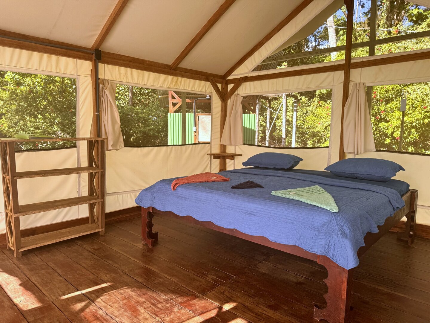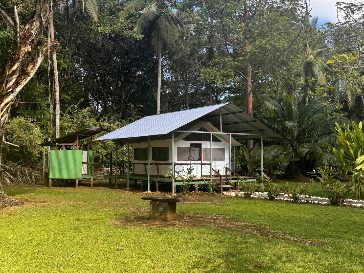 You will stay in a peaceful, spacious glamping tent with a double bed, private views, a wrap‑around terrace, a private bathroom and tranquility. You will likely be able to choose between a tent in the garden and one on the edge of the rainforest. Each has its own charm. Each is unique in its own way.