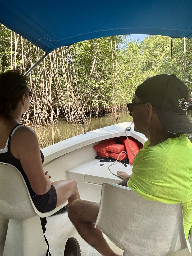 We will meet in the town of Sierpe on the Osa Peninsula, where we’ll pick you up by our boat and take you along the river and through the mangroves to us — and back again. Departure from Sierpe is between 1:00–3:00 PM. Return time by arrangement.